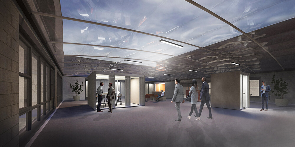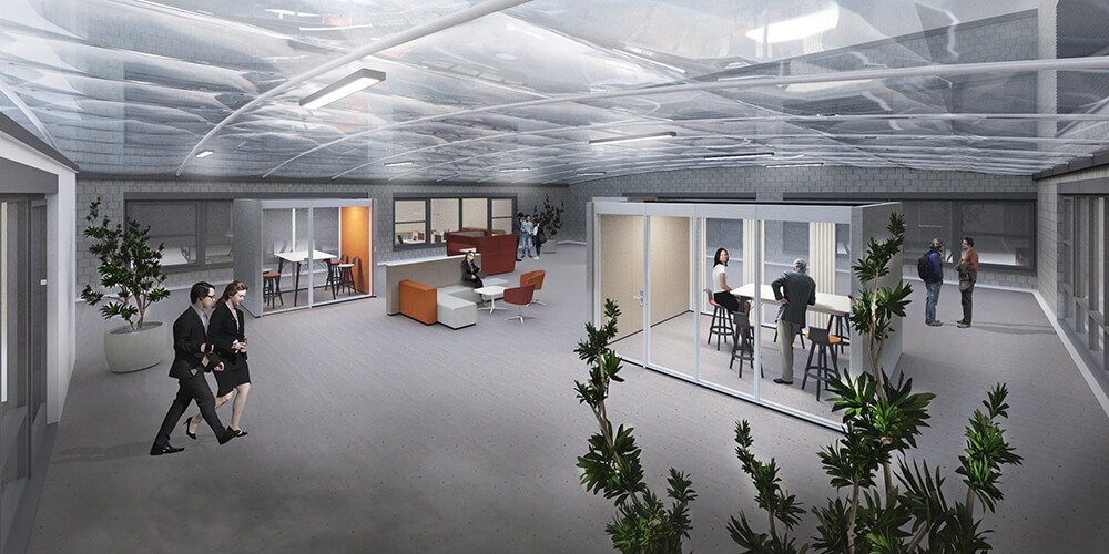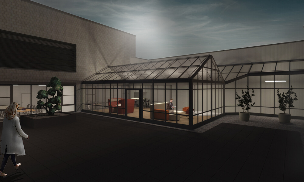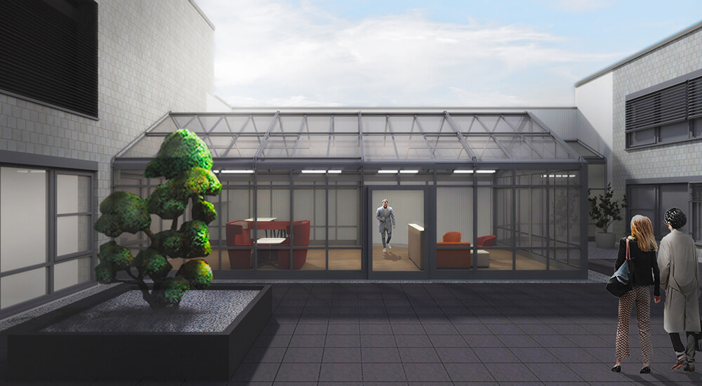 Entwurf Neubau/Überbauung Innenhof für Präsentation/Kollaboration/Kommunikation