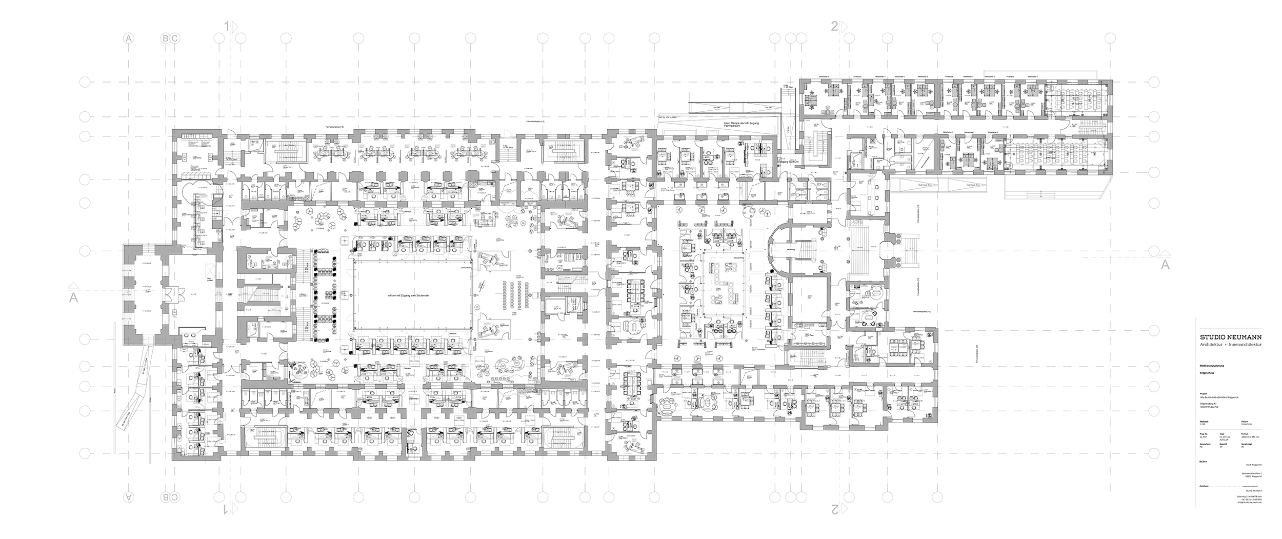 Objektplanung 2023-heute Objektplanung Innenräume für das Gebäude der alten Bundesbahndirektion in Wuppertal. Entwurf, Planung, Konstruktion und Einrichtung von öffentlichen und nicht-öffentlichen Bereichen. Wuppertal, 2023-heute